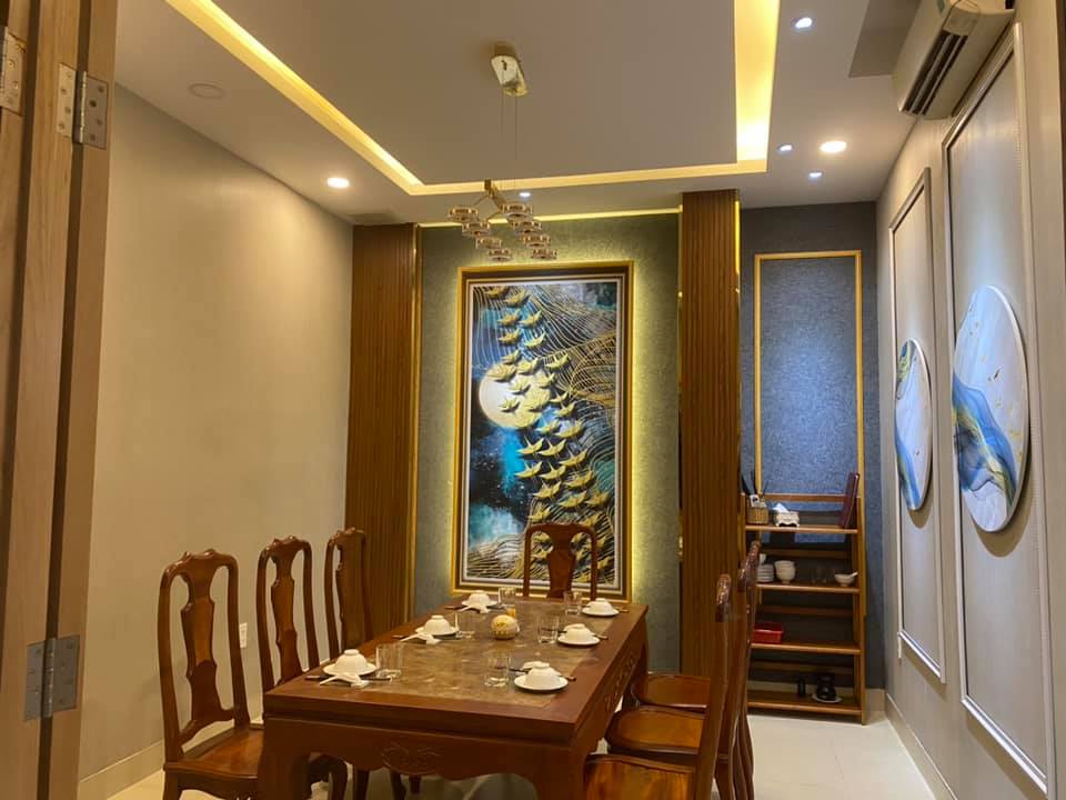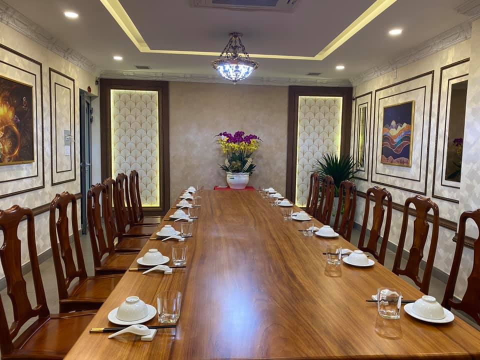 Không gian phòng ăn Vip 2 dành cho các cặp đôi hay dành cho gia đình nhỏ. Với không gian nhỏ nhưng cũng được trang trí tinh tế với những bức họa núi non, hay được trang trí bằng các vách cnc bằng gỗ kết hợp đèn led nổi bật. Ngoài ra mảng tường được dán giấy dán tường họa tiết tân cổ điển cao cấp, sang trọng. Ở không gian phòng này tuy nhỏ nhưng lại mang đến sự gần gũi, điềm đạm cho người dùng.