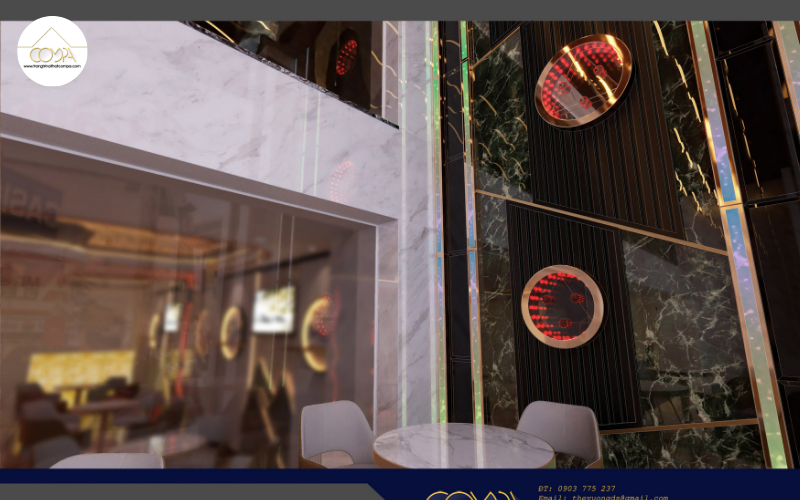 Đề bài với những hiện trạng xây dựng cũ đã có sẵn (cột, vách đá, trần thạch cao), cần biến hóa chúng thành những điểm trang trí nội bật cho không gian lễ tân. Mong muốn đổi phong cách thiết kế hiện đại, tươi trẻ và một không gian cafe thật "Chill" cho khách thư giãn tại đây.